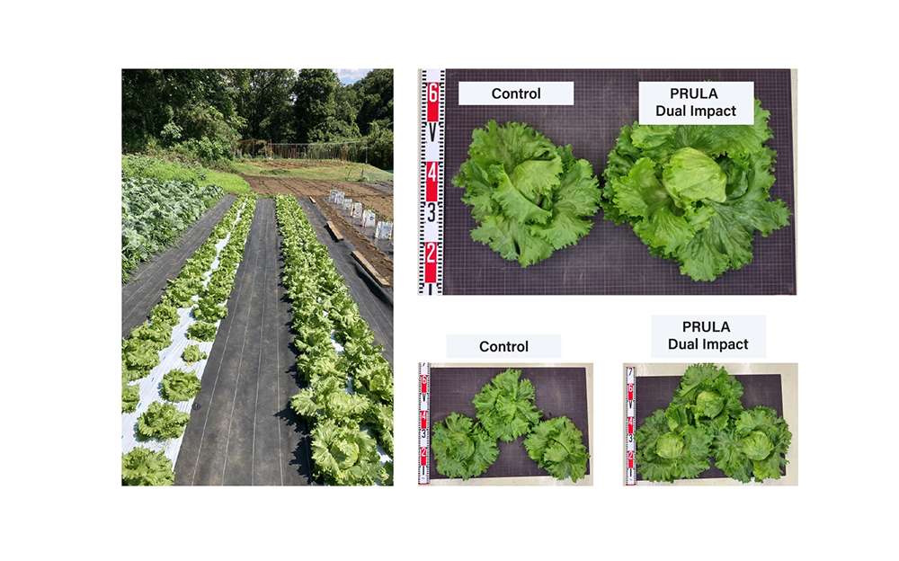 O gráfico ilustra o efeito da aplicação do PRULA Dual Impact (PDI) no peso fresco da alface em comparação com o grupo controle. A alface tratada com PDI a uma taxa total de 9,6 L/ha, por meio de imersão no transplante e irrigação subsequente, apresentou um aumento significativo no peso fresco, com valores medianos e superiores muito mais elevados do que os do controle.Esses resultados sugerem que a aplicação de PDI melhora a acumulação de biomassa, especialmente quando aplicada em múltiplos estágios, utilizando tanto o método de imersão quanto a irrigação por gotejamento.